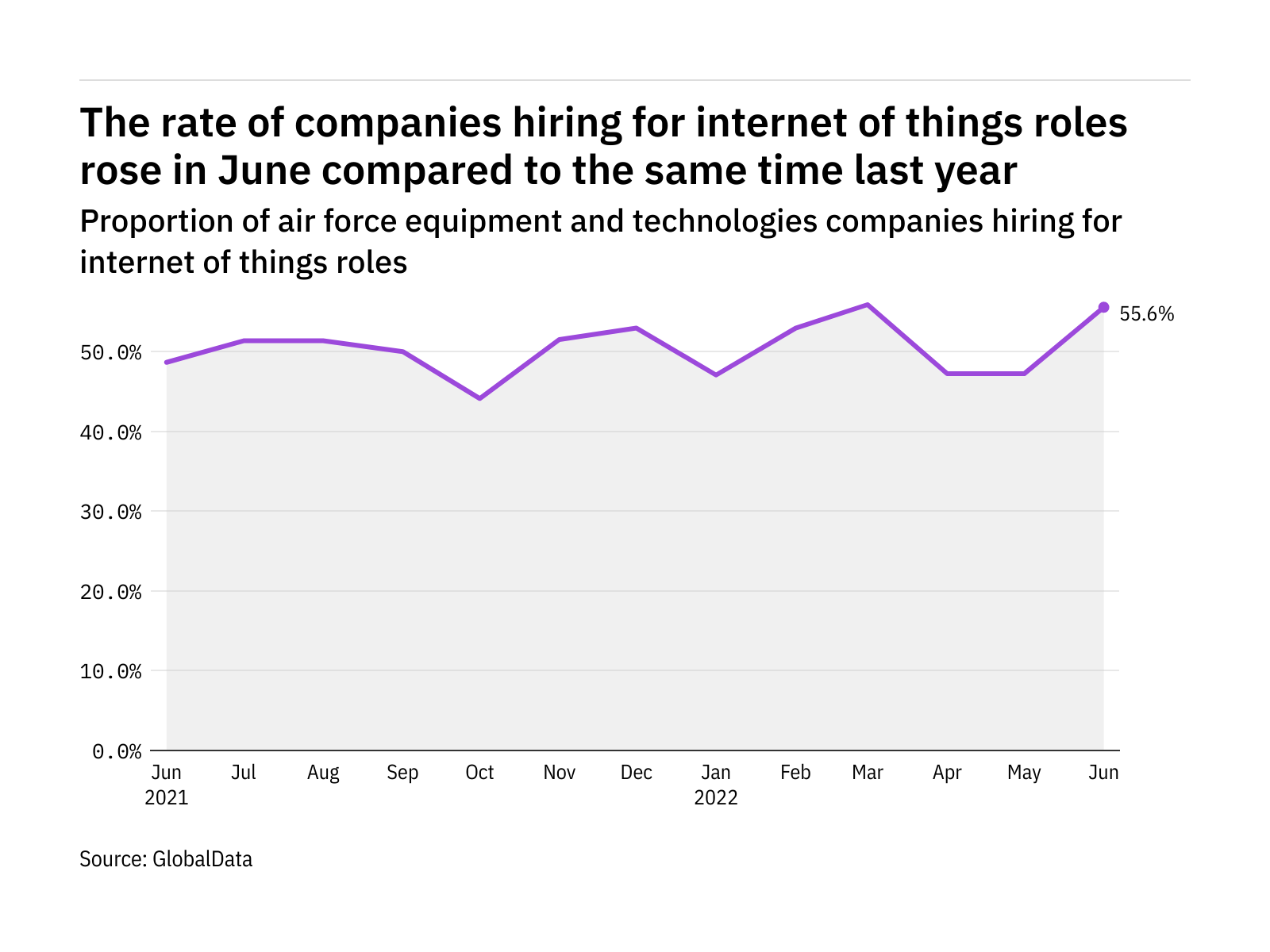 The proportion of air force equipment and technologies companies hiring for internet of things related positions rose in June 2022 compared with the equivalent month last year, with 55.6% of the companies included in our analysis recruiting for at least one such position.