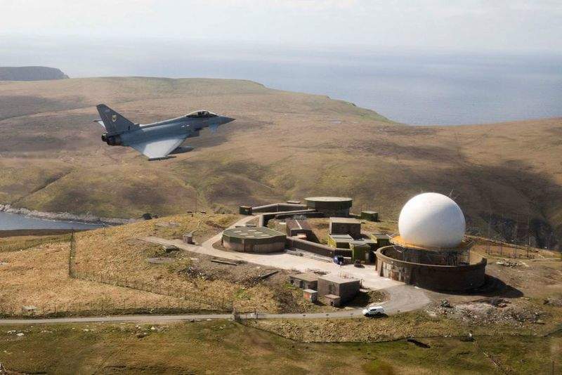 A Eurofighter Typhoon fighter aircraft of the UK Royal Air Force (RAF) took off from RAF Lossiemouth to fly over the newly installed air defence radar at Saxa Vord on the island of Unst, Shetland, Scotland.