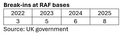 UK Royal Air Force (RAF) bases have been broken into on eight separate occasions so far in 2025, an increase from each of the past three years, with the country’s numerous airbases apparently the most vulnerable to trespass.