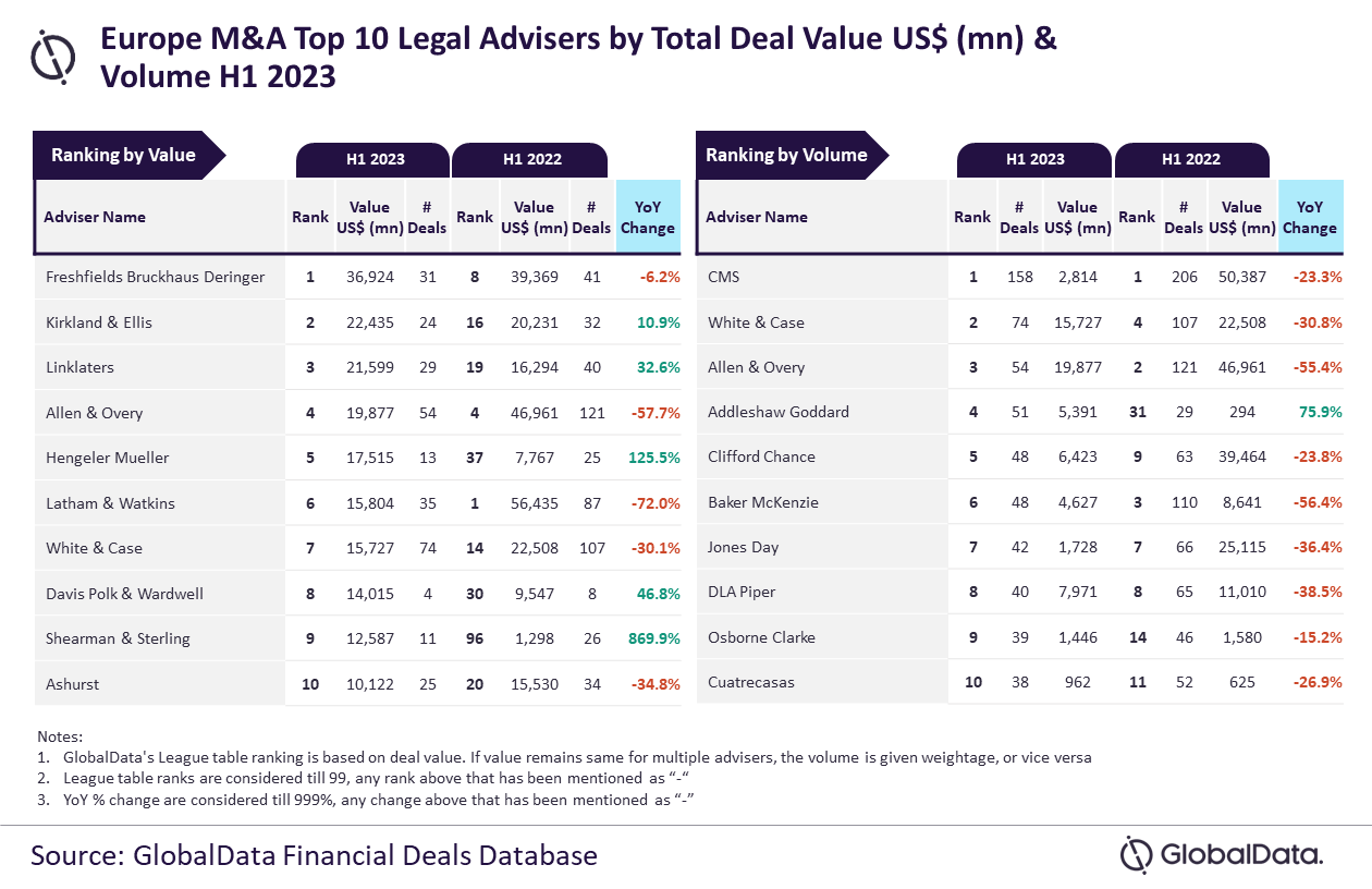 Freshfields Bruckhaus Deringer and CMS were the top mergers and acquisitions (M&A) legal advisers in Europe in H1 2023, according to GlobalData’s latest league table.