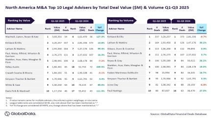 Wachtell, Lipton, Rosen & Katz and Kirkland & Ellis have emerged as the top mergers and acquisitions (M&A) legal advisers in North America in terms of value and volume, respectively, for the first three quarters of 2025.